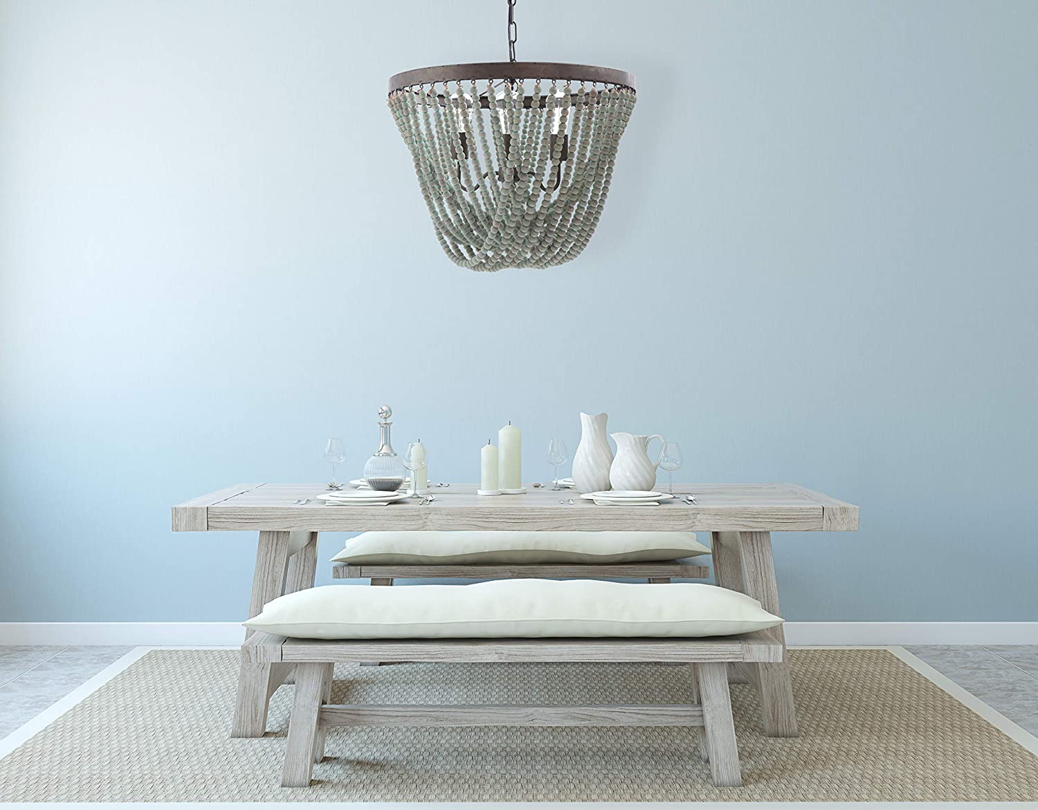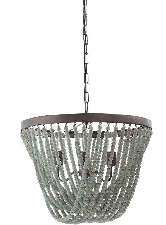 - This wood beaded chandelier is made with high-quality, aqua color wood beads which are complemented by an elegant metal frame