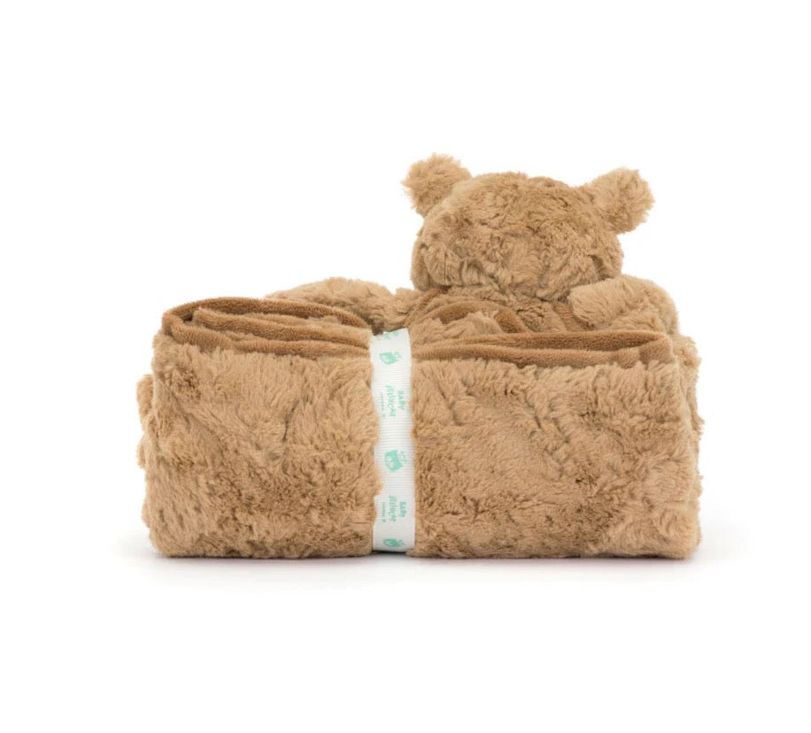The Bartholomew Bear Blankie is a gorgeous gift of gently textured softness, featuring our most loved bear, rolled and presented in a Baby Jellycat grosgrain ribbon. Made with recycled fibres, this soft blankie has Bartholomew Bear’s gently rounded head and ears and outstretched arms peeking over the edge ensuring a favourite friend is never far away.