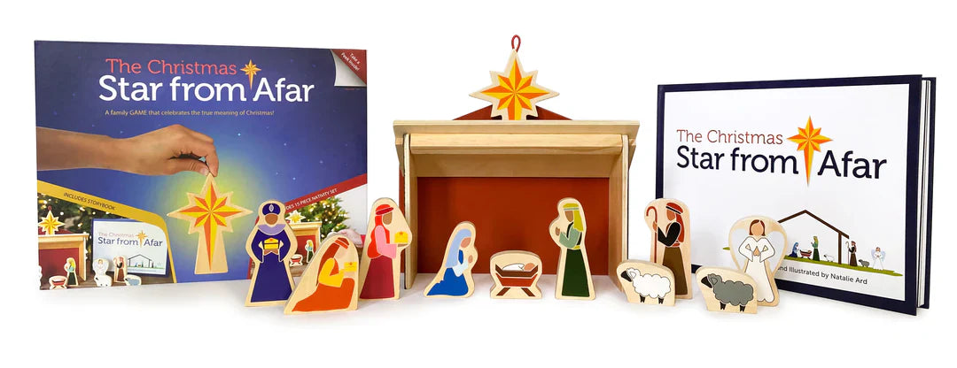 The Star From Afar is a family tradition that celebrates the true meaning of Christmas. This item comes with a hardcover book, a 14-piece colorful wooden nativity set, and a wooden star. This fun hide-n-seek game encourages children to go on a hunt for their Star, similar to that of the Wise Men. Every night the Star is hidden in the child’s home. The next morning the child will search high and low until they locate it. Once they have found their Star they move all Three Wise Men to the star’s location. They will repeat this over and over again until Christmas morning when the star will be found on top of the stable above baby Jesus!
