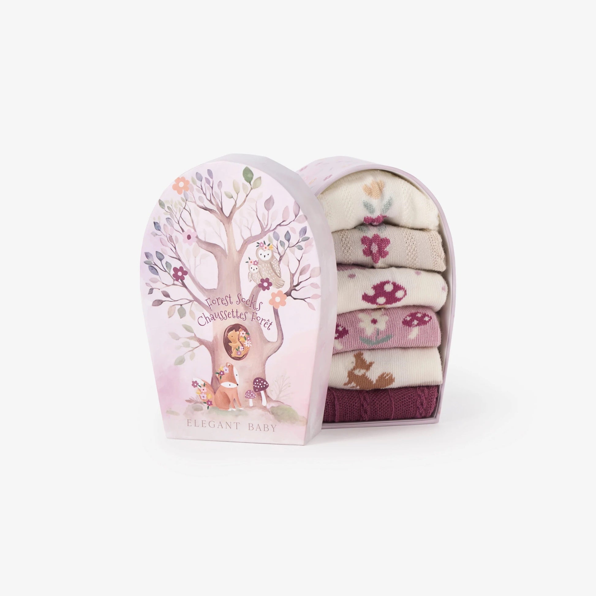 Keep little toes warm and stylish with this 6-pack of woodland-inspired baby socks, featuring non-slip grips for those first wobbly steps. In hues of violet, cream, and taupe, these cozy socks blend practicality with adorable charm, all beautifully presented in a hand-illustrated gift box. Perfect for gifting and autumn adventures.
