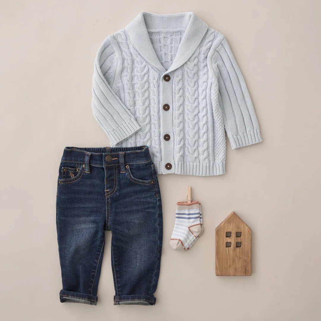 There's something oh so cute about tiny baby jeans. Made of durable yet buttery soft denim for baby and presented in a beautiful gift box, My First Jeans are sure to be the ultimate keep sake no matter the gender. Complete the look with our classic horseshoe cable cardigans and a matching pair of socks