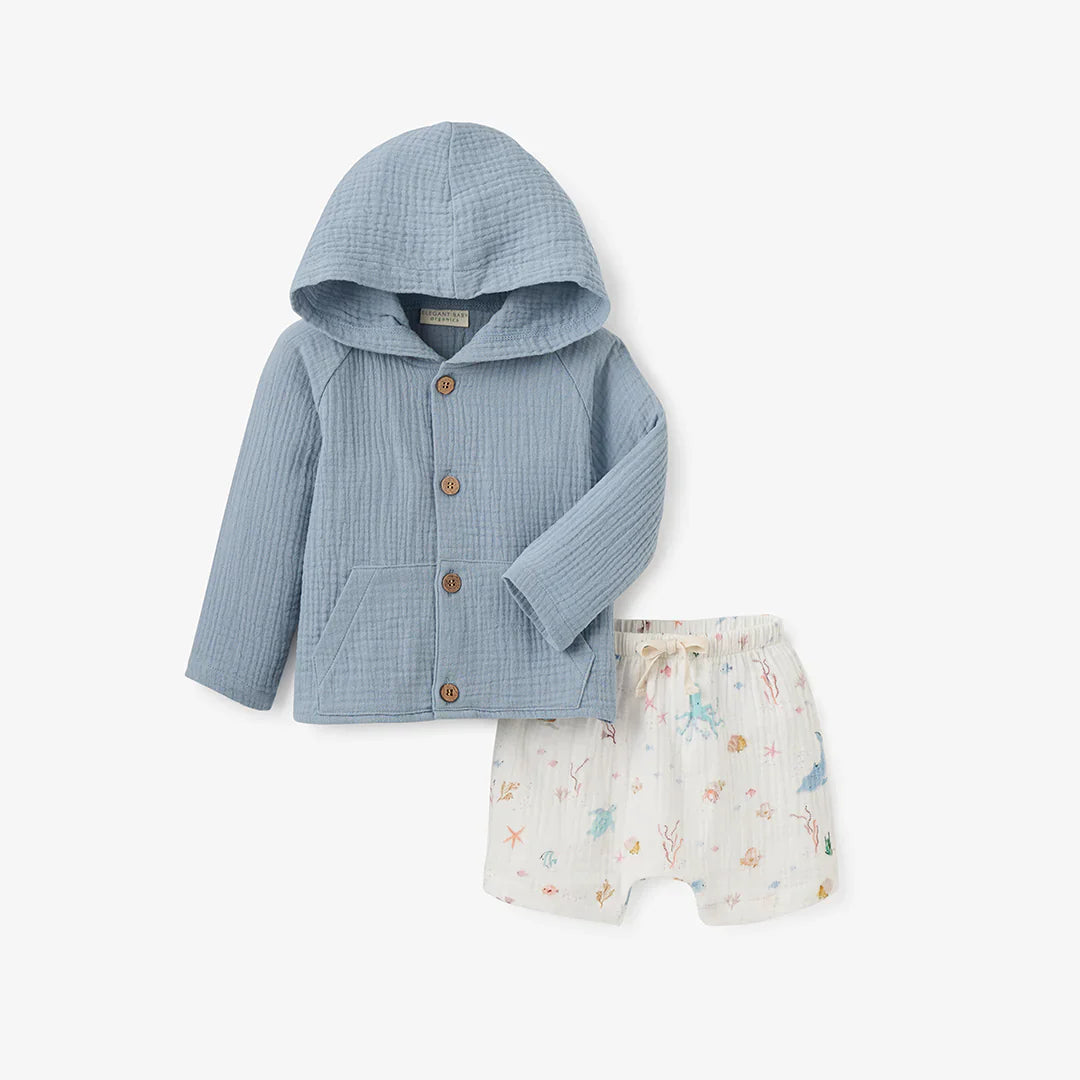 Good for baby, good for the environment. Our organic, naturally sustainable muslin is soft and breathable, ideal for outdoor adventures during the spring and summertime. Cast in a dreamy palette, this muslin hoodie + short set combines fashion and function for the modern child. Wooden buttons add an extra dash of style to this already stunning organic baby set.