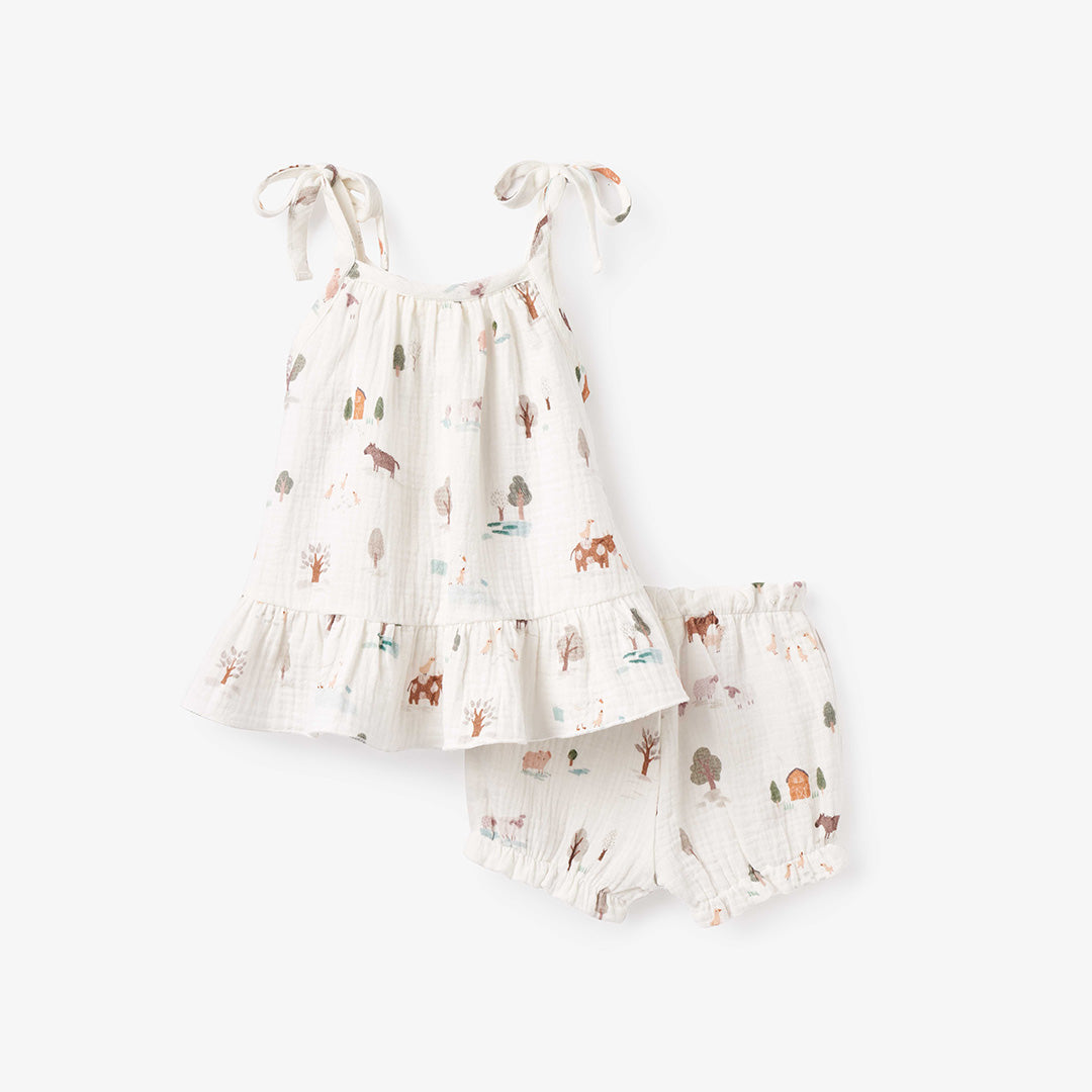 Good for baby, good for the environment. Our organic, naturally sustainable muslin is soft and breathable, ideal for outdoor adventures during the spring and summertime. Cast in a dreamy palette, this muslin tie top dress set combines fashion and function for the modern child.