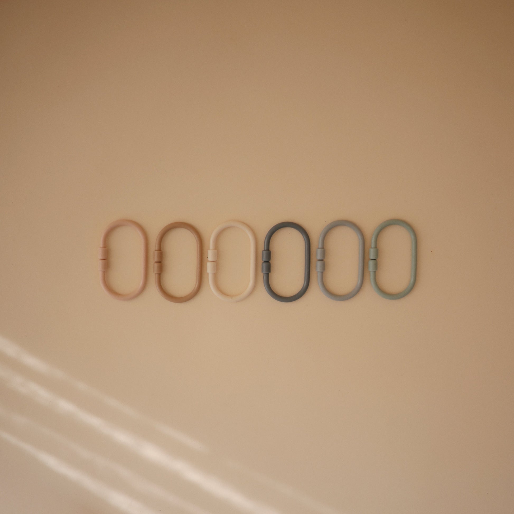 Keep toys within reach while engaging littles in a playful learning experience with our chain link rings. These durable, yet flexible plastic links can quickly attach toys to strollers and car seats, ensuring that favorite companions are always close by. Each set features three soft colors to help engage little ones and improve sorting skills. The minimal design and smooth, lightweight non-toxic material makes it easy for small hands to grasp and manipulate, enhancing fine motor skills.