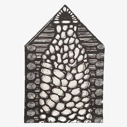 - Illustrated fabric print of logs, stone chimney, and "hinged" door