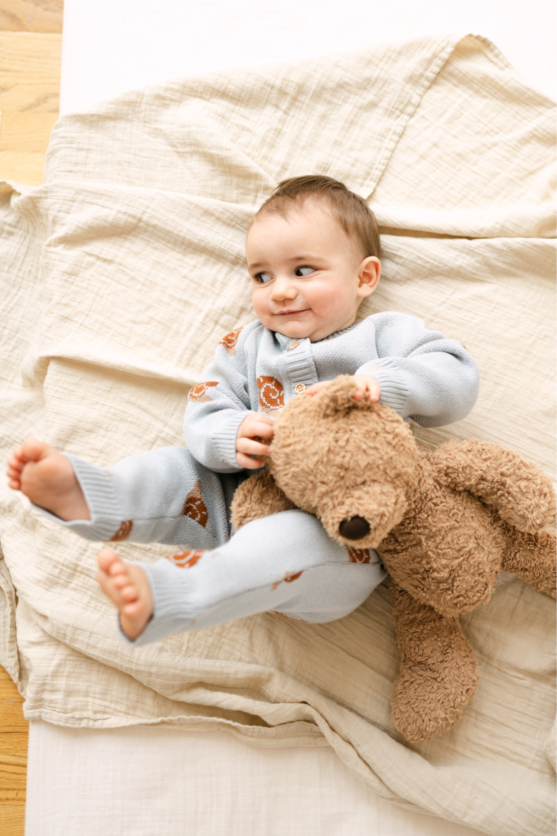 Create a sibling matching moment with our Organic Snail Knit Sweater in Pearl Blue available in sizes through 4/5T.