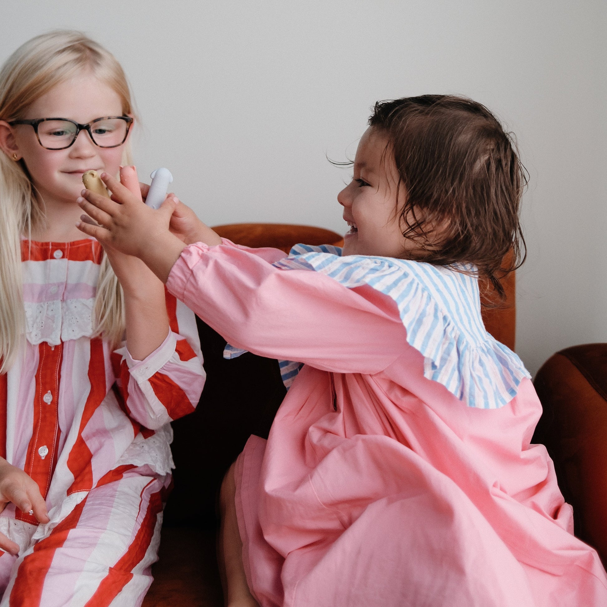 Crafted from non-toxic silicone, Mushie finger puppets fit on small fingers, making them easy for children to handle and manipulate. Designed wide enough to also fit most adult fingers, so parents can join in on the fun. The set includes a cat, lamb, bunny, bear, and dog, each brightly colored and detailed to engage young imaginations.