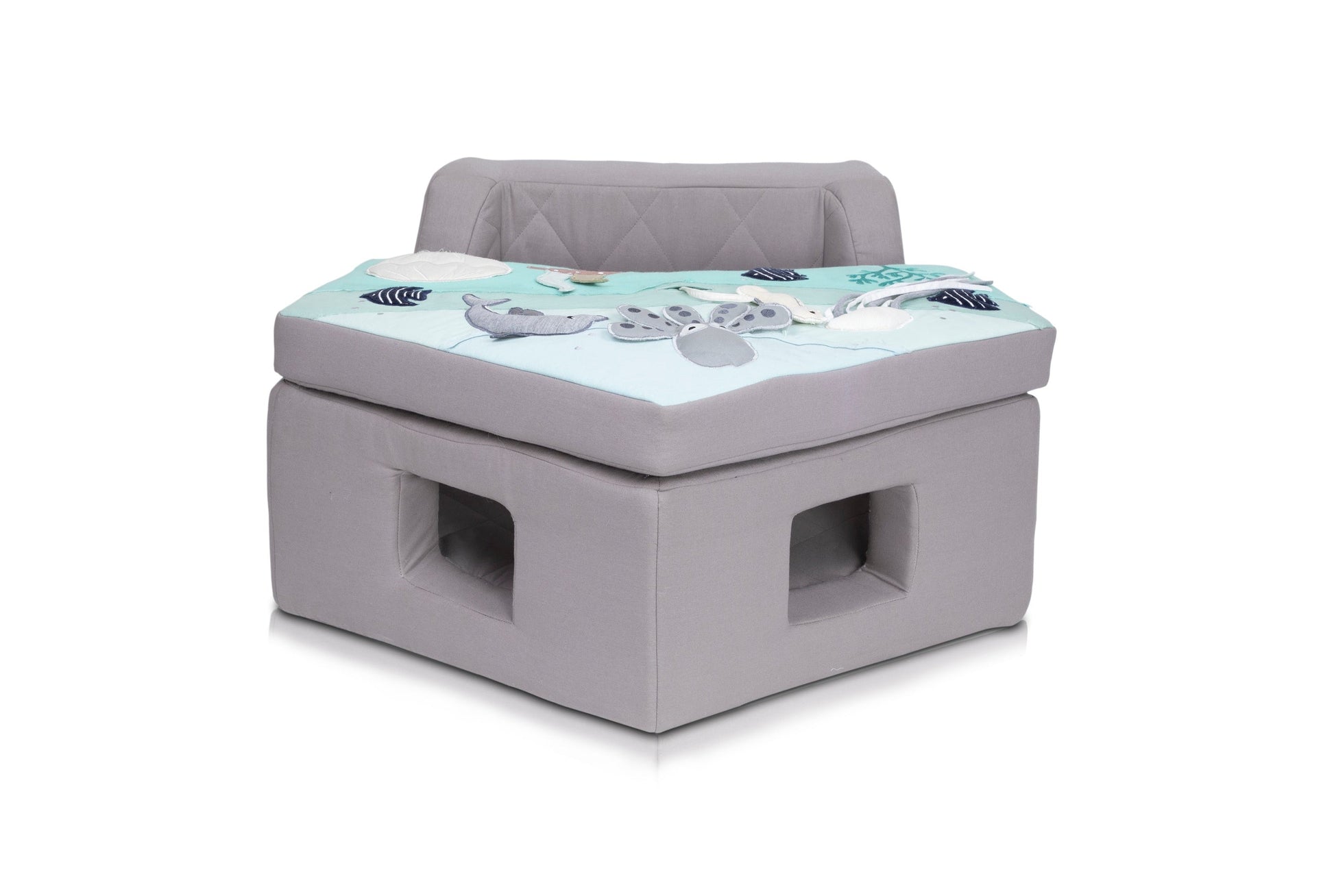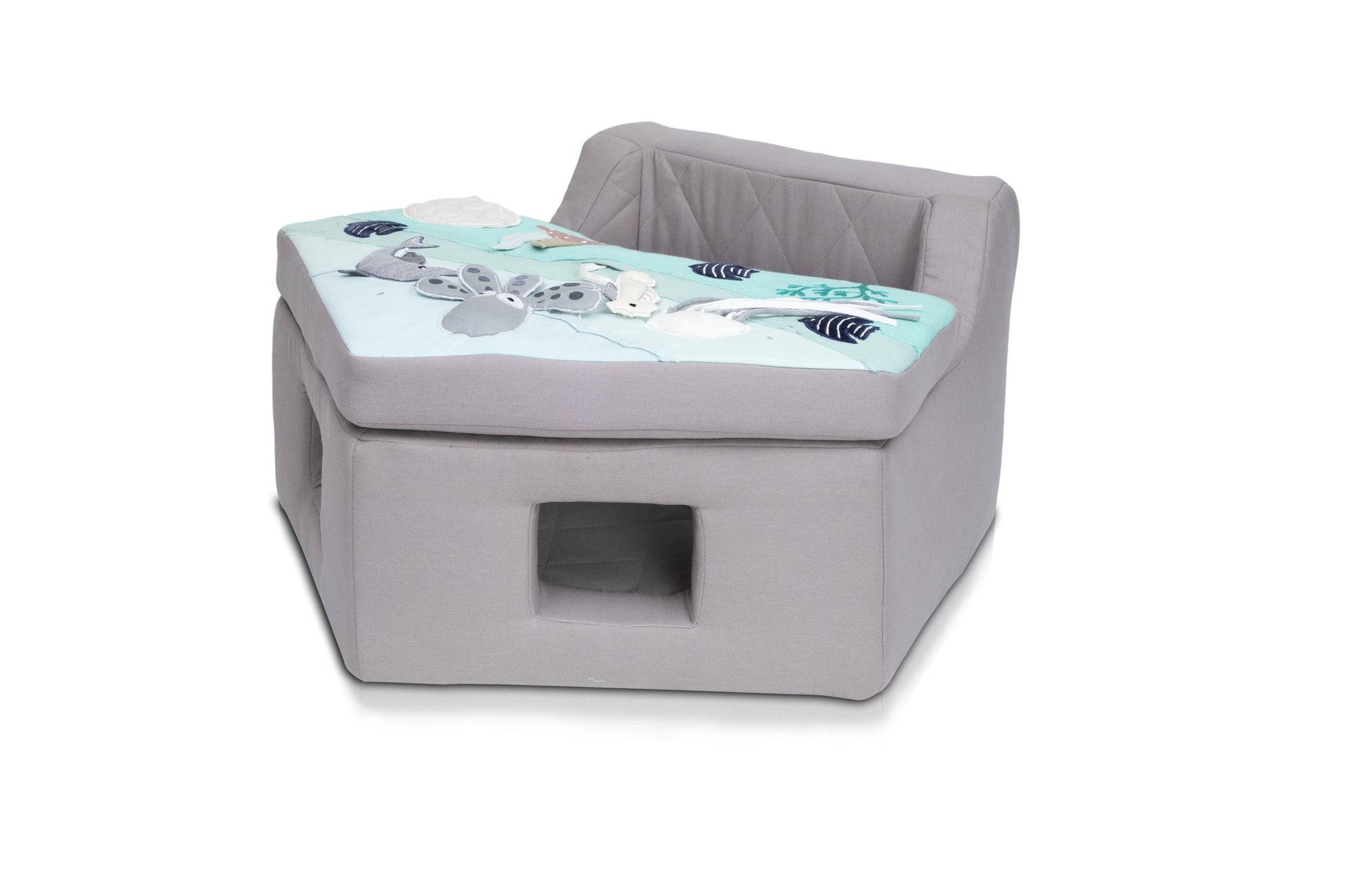 Pint-sized sailors, beach babies, and young oceanographers won't be able to resist playing in this undersea activity center. Crafted in India, this aquamarine cotton design features a vivid cast of aquatic characters to entertain your little one. The detachable tray offers an array of undersea delights, including a clandestine seahorse, a rattling fish, and a squeaky stingray. Crinkly octopus appendages, a secret lobster, a mirrored oyster, and many other items encourage stimulation and exploration for your baby. A cotton seat conveniently allows for cozy journeys into the imaginary ocean. Complete the experience by pairing with the Under the Sea Play Mat and Tummy Time Toy for a mesmerizing underwater adventure, all from the coziness of the nursery. The activity center should be used only on the floor and must be supervised by an adult at all times. The waist harness and tray must be securely fastened before use. Comprised of 100% cotton canvas, 100% hypoallergenic polyester fiber, and 100% polyurethane foam, this handmade, embroidered product should be spot-cleaned only and is ideal for infants aged 3 months or older who can sit unassisted. Coordinates with the UNDER THE SEA TUMMY TIME TOY AND PLAY GYM. Made in India.