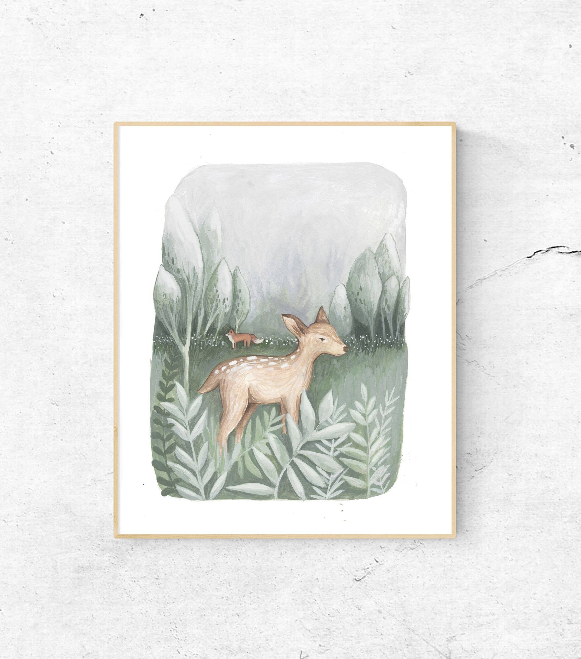 Woodland deer illustration painted in watercolors and fluid acrylic. Great for a children's bedroom or nursery. Pair this with artwork with the Woodland Bear to make a lovely woodland theme in your nursery!